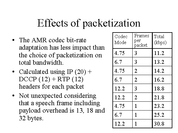 Effects of packetization The AMR codec bit-rate adaptation has less impact than the choice of packetization on total bandwidth. Calculated using IP (20) + DCCP (12) + RTP (12) headers for each packet Not unexpected considering that a speech frame including payload overhead is 13, 18 and 32 bytes. |