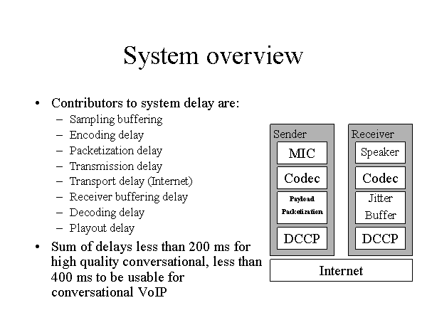 Receiver Sender System overview Contributors to system delay are: Sampling buffering Encoding delay Packetization delay Transmission delay Transport delay (Internet) Receiver buffering delay Decoding delay Playout delay Sum of delays less than 200 ms for high quality conversational, less than 400 ms to be usable for conversational VoIP Codec MIC Payload Packetization DCCP Internet Codec Speaker DCCP Jitter Buffer |