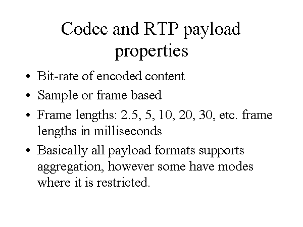 Codec and RTP payload properties Bit-rate of encoded content Sample or frame based Frame lengths: 2.5, 5, 10, 20, 30, etc. frame lengths in milliseconds Basically all payload formats supports aggregation, however some have modes where it is restricted. |