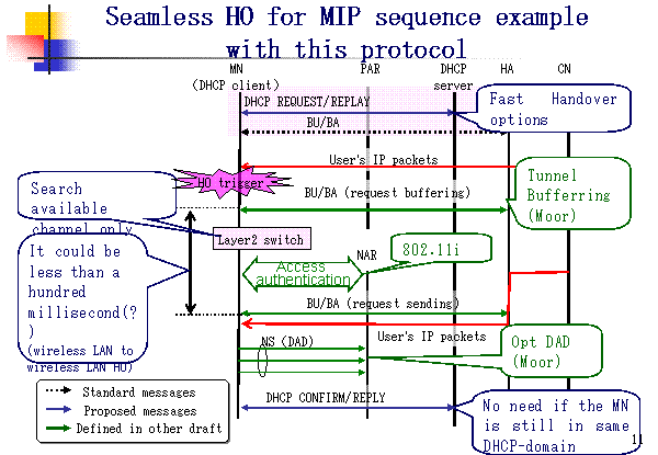 Seamless HO for MIP sequence example with this protocol MN (DHCP client) DHCP server PAR NAR Layer2 switch DHCP CONFIRM/REPLY CN NS(DAD) HA DHCP REQUEST/REPLAY BU/BA BU/BA (request sending) Fast Handover options BU/BA (request buffering) Opt DAD (Moor) No need if the MN is still in same DHCP-domain User’s IP packets User’s IP packets It could be less than a hundred millisecond(?) (wireless LAN to wireless LAN HO) Tunnel Bufferring (Moor) Standard messages Proposed messages Defined in other draft Search available channel only HO trigger Access authentication 802.11i |
