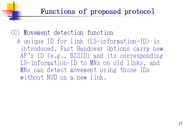 Functions of proposed protocol (C) Movement detection function A unique ID for link (L3-information-ID) is introduced. Fast Handover Options carry new AP's ID (e.g., BSSID) and its corresponding L3-information-ID to MNs on old links, and MNs can detect movement using those IDs without NUD on a new link. |
