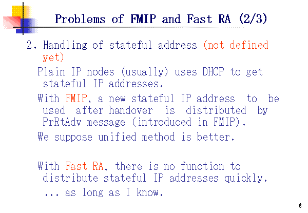 Problems of FMIP and Fast RA (2/3) 2. Handling of stateful address (not defined yet) Plain IP nodes (usually) uses DHCP to get stateful IP addresses. With FMIP, a new stateful IP address to be used after handover is distributed by PrRtAdv message (introduced in FMIP). We suppose unified method is better. With Fast RA, there is no function to distribute stateful IP addresses quickly. ... as long as I know. |
