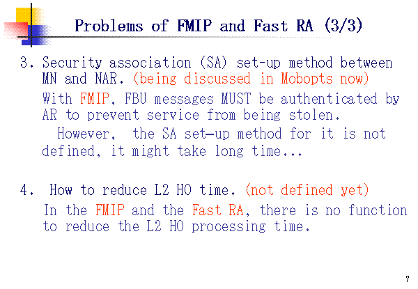 Problems of FMIP and Fast RA (3/3) Security association (SA) set-up method between MN and NAR. (being discussed in Mobopts now) With FMIP, FBU messages MUST be authenticated by AR to prevent service from being stolen. However, the SA set–up method for it is not defined, it might take long time... 4. How to reduce L2 HO time. (not defined yet) In the FMIP and the Fast RA, there is no function to reduce the L2 HO processing time. |
