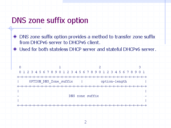 DNS zone suffix option DNS zone suffix option provides a method to transfer zone suffix from DHCPv6 server to DHCPv6 client. Used for both stateless DHCP server and stateful DHCPv6 server. 0 1 2 3 0 1 2 3 4 5 6 7 8 9 0 1 2 3 4 5 6 7 8 9 0 1 2 3 4 5 6 7 8 9 0 1 +-+-+-+-+-+-+-+-+-+-+-+-+-+-+-+-+-+-+-+-+-+-+-+-+-+-+-+-+-+-+-+-+ | OPTION_DNS_Zone_suffix | option-length | +-+-+-+-+-+-+-+-+-+-+-+-+-+-+-+-+-+-+-+-+-+-+-+-+-+-+-+-+-+-+-+-+ | | ~ DNS zone suffix ~ | | +-+-+-+-+-+-+-+-+-+-+-+-+-+-+-+-+-+-+-+-+-+-+-+-+-+-+-+-+-+-+-+-+ |