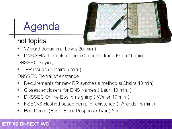 Agenda hot topics Wilcard document (Lewis 20 min ) DNS SHA-1 attack impact (Olafur Gudmundsson 10 min) DNSSEC Keying IPR issues ( Chairs 5 min.) DNSSEC Denial of existence Requirements for new RR synthesis method s(Chairs 10 min) Closest enclosers for DNS Names ( Lauri 10 min. ) DNSSEC Online Epsilon signing ( Weiler 10 min.) NSECv3 Hashed based denial of existence ( Arends 15 min.) Bert Denial (Basic Error Response Type) 5 min. |