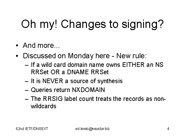 Oh my! Changes to signing? And more... Discussed on Monday here - New rule: If a wild card domain name owns EITHER an NS RRSet OR a DNAME RRSet It is NEVER a source of synthesis Queries return NXDOMAIN The RRSIG label count treats the records as non-wildcards |