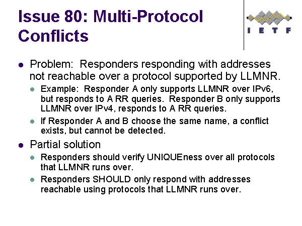 Issue 80: Multi-Protocol Conflicts Problem: Responders responding with addresses not reachable over a protocol supported by LLMNR. Example: Responder A only supports LLMNR over IPv6, but responds to A RR queries. Responder B only supports LLMNR over IPv4, responds to A RR queries. If Responder A and B choose the same name, a conflict exists, but cannot be detected. Partial solution Responders should verify UNIQUEness over all protocols that LLMNR runs over. Responders SHOULD only respond with addresses reachable using protocols that LLMNR runs over. |