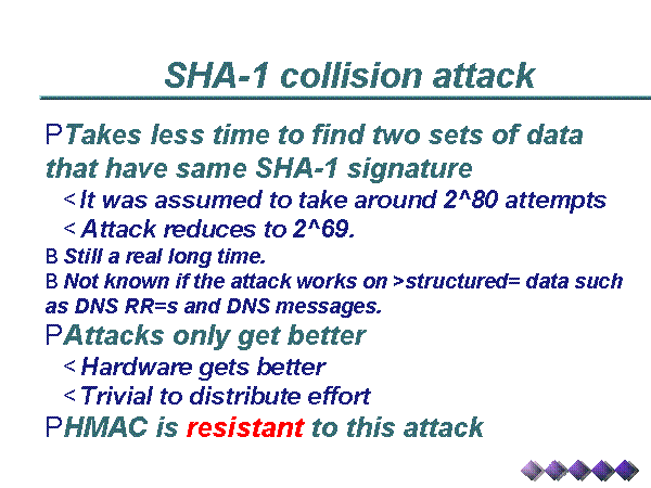 SHA-1 collision attack Takes less time to find two sets of data that have same SHA-1 signature It was assumed to take around 2^80 attempts Attack reduces to 2^69. Still a real long time. Not known if the attack works on >structured= data such as DNS RR=s and DNS messages. Attacks only get better Hardware gets better Trivial to distribute effort HMAC is resistant to this attack |