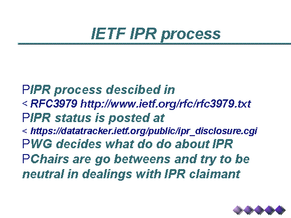 IETF IPR process IPR process descibed in RFC3979 http://www.ietf.org/rfc/rfc3979.txt IPR status is posted at https://datatracker.ietf.org/public/ipr_disclosure.cgi WG decides what do do about IPR Chairs are go betweens and try to be neutral in dealings with IPR claimant |