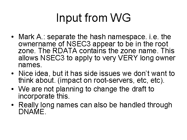 Input from WG Mark A.: separate the hash namespace. i.e. the ownername of NSEC3 appear to be in the root zone. The RDATA contains the zone name. This allows NSEC3 to apply to very VERY long owner names. Nice idea, but it has side issues we don’t want to think about. (impact on root-servers, etc, etc). We are not planning to change the draft to incorporate this. Really long names can also be handled through DNAME. |