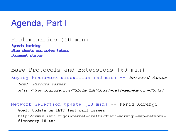 Agenda, Part I Preliminaries (10 min) Agenda bashing Blue sheets and notes takers Document status Base Protocols and Extensions (60 min) Keying Framework discussion (50 min) -- Bernard Aboba Goal: Discuss issues http://www.drizzle.com/~aboba/EAP/draft-ietf-eap-keying-05.txt Network Selection update (10 min) -- Farid Adrangi Goal: Update on IETF last call issues http://wwww.ietf.org/internet-drafts/draft-adrangi-eap-network-discovery-10.txt |