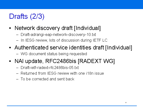 Drafts (2/3) Network discovery draft [Individual] Draft-adrangi-eap-network-discovery-10.txt In IESG review, lots of discussion during IETF LC Authenticated service identities draft [Individual] WG document status being requested NAI update, RFC2486bis [RADEXT WG] Draft-ietf-radext-rfc2486bis-05.txt Returned from IESG review with one i18n issue To be corrected and sent back |