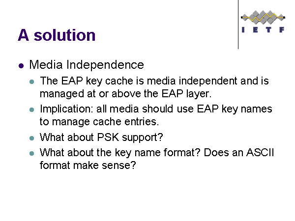 A solution Media Independence The EAP key cache is media independent and is managed at or above the EAP layer. Implication: all media should use EAP key names to manage cache entries. What about PSK support? What about the key name format? Does an ASCII format make sense? |