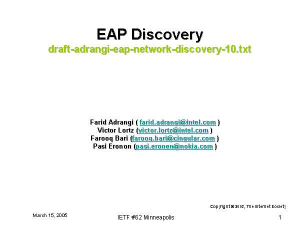 EAP Discovery draft-adrangi-eap-network-discovery-10.txt Farid Adrangi ( farid.adrangi@intel.com ) Victor Lortz (victor.lortz@intel.com ) Farooq Bari (farooq.bari@cingular.com ) Pasi Eronon (pasi.eronen@nokia.com ) Copyright © 2003, The Internet Society |