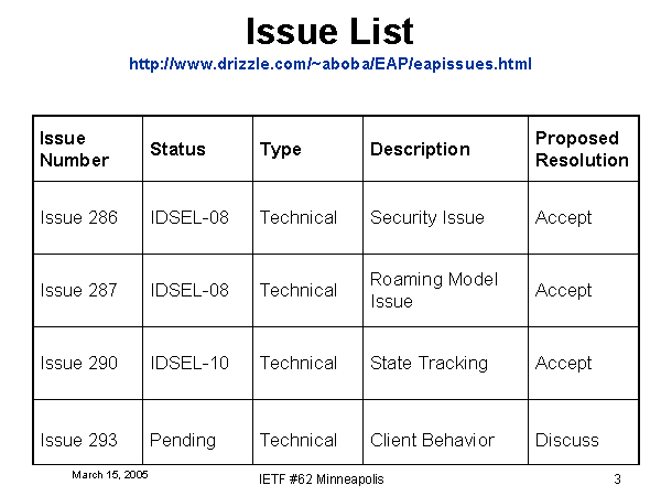 Issue Listhttp://www.drizzle.com/~aboba/EAP/eapissues.html