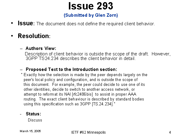 Issue 293(Submitted by Glen Zorn) Issue: The document does not define the required client behavior. Resolution: Authors View: Description of client behavior is outside the scope of the draft. However, 3GPP TS24.234 describes the client behavior in detail. Proposed Text to the Introduction section: “ Exactly how the selection is made by the peer depends largely on the peer's local policy and configuration, and is outside the scope of this document. For example, the peer could decide to use one of its other identities, decide to switch to another access network, or attempt to reformat its NAI [rfc2486bis] to assist in proper AAA routing. The exact client behaviour is described by standard bodies using this specification such as 3GPP [TS.24.234].” Status: Discuss |