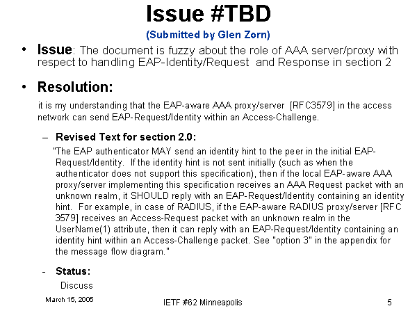 Issue #TBD(Submitted by Glen Zorn) Issue: The document is fuzzy about the role of AAA server/proxy with respect to handling EAP-Identity/Request and Response in section 2 Resolution: it is my understanding that the EAP-aware AAA proxy/server [RFC3579] in the access network can send EAP-Request/Identity within an Access-Challenge. Revised Text for section 2.0: “The EAP authenticator MAY send an identity hint to the peer in the initial EAP-Request/Identity. If the identity hint is not sent initially (such as when the authenticator does not support this specification), then if the local EAP-aware AAA proxy/server implementing this specification receives an AAA Request packet with an unknown realm, it SHOULD reply with an EAP-Request/Identity containing an identity hint. For example, in case of RADIUS, if the EAP-aware RADIUS proxy/server [RFC 3579] receives an Access-Request packet with an unknown realm in the UserName(1) attribute, then it can reply with an EAP-Request/Identity containing an identity hint within an Access-Challenge packet. See "option 3" in the appendix for the message flow diagram.” Status: Discuss |