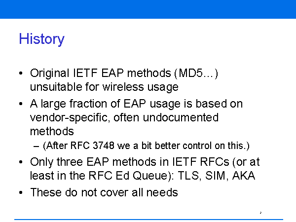 History Original IETF EAP methods (MD5…) unsuitable for wireless usage A large fraction of EAP usage is based on vendor-specific, often undocumented methods (After RFC 3748 we a bit better control on this.) Only three EAP methods in IETF RFCs (or at least in the RFC Ed Queue): TLS, SIM, AKA These do not cover all needs |