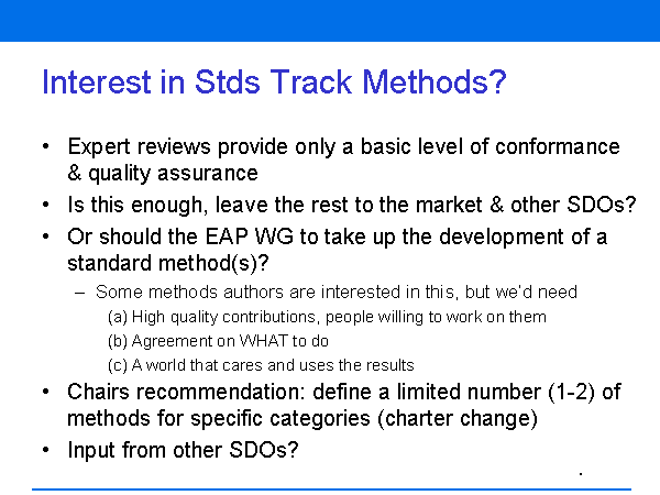 Interest in Stds Track Methods? Expert reviews provide only a basic level of conformance & quality assurance Is this enough, leave the rest to the market & other SDOs? Or should the EAP WG to take up the development of a standard method(s)? Some methods authors are interested in this, but we’d need (a) High quality contributions, people willing to work on them (b) Agreement on WHAT to do (c) A world that cares and uses the results Chairs recommendation: define a limited number (1-2) of methods for specific categories (charter change) Input from other SDOs? |
