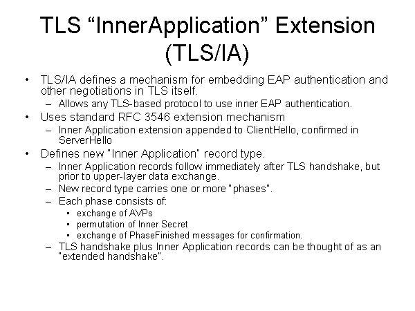 TLS “InnerApplication” Extension(TLS/IA) TLS/IA defines a mechanism for embedding EAP authentication and other negotiations in TLS itself. Allows any TLS-based protocol to use inner EAP authentication. Uses standard RFC 3546 extension mechanism Inner Application extension appended to ClientHello, confirmed in ServerHello Defines new “Inner Application” record type. Inner Application records follow immediately after TLS handshake, but prior to upper-layer data exchange. New record type carries one or more “phases”. Each phase consists of: exchange of AVPs permutation of Inner Secret exchange of PhaseFinished messages for confirmation. TLS handshake plus Inner Application records can be thought of as an “extended handshake”. |