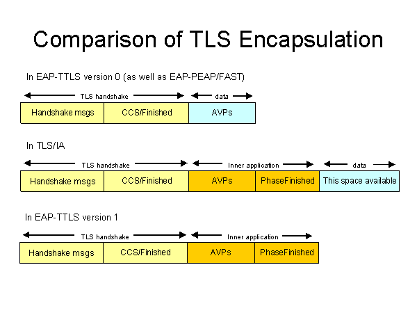 Comparison of TLS Encapsulation Handshake msgs CCS/Finished AVPs Handshake msgs CCS/Finished AVPs PhaseFinished This space available In EAP-TTLS version 0 (as well as EAP-PEAP/FAST) In TLS/IA TLS handshake data TLS handshake data Inner application Handshake msgs CCS/Finished AVPs PhaseFinished In EAP-TTLS version 1 TLS handshake Inner application |