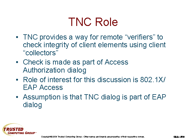 TNC Role TNC provides a way for remote “verifiers” to check integrity of client elements using client “collectors” Check is made as part of Access Authorization dialog Role of interest for this discussion is 802.1X/ EAP Access Assumption is that TNC dialog is part of EAP dialog |