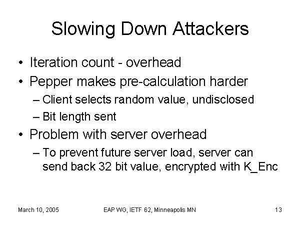Slowing Down Attackers Iteration count - overhead Pepper makes pre-calculation harder Client selects random value, undisclosed Bit length sent Problem with server overhead To prevent future server load, server can send back 32 bit value, encrypted with K_Enc |