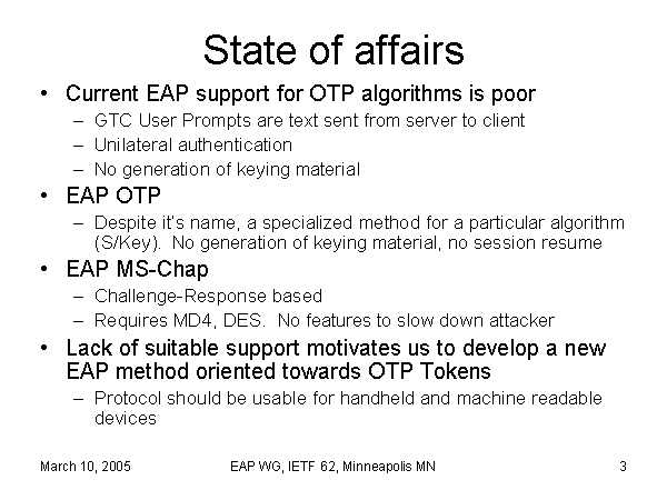 State of affairs Current EAP support for OTP algorithms is poor GTC User Prompts are text sent from server to client Unilateral authentication No generation of keying material EAP OTP Despite it’s name, a specialized method for a particular algorithm (S/Key). No generation of keying material, no session resume EAP MS-Chap Challenge-Response based Requires MD4, DES. No features to slow down attacker Lack of suitable support motivates us to develop a new EAP method oriented towards OTP Tokens Protocol should be usable for handheld and machine readable devices |