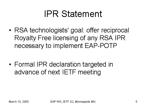 RSA technologists' goal: offer reciprocal Royalty Free licensing of any RSA IPR necessary to implement EAP-POTP
