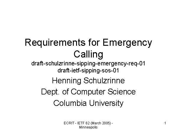Requirements for Emergency Callingdraft-schulzrinne-sipping-emergency-req-01draft-ietf-sipping-sos-01
