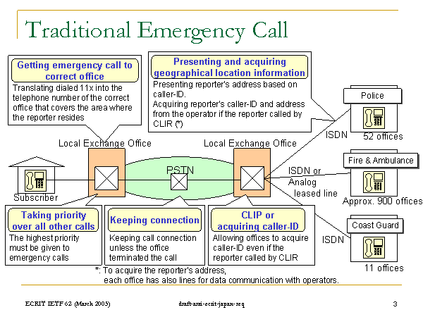 PSTN Traditional Emergency Call Local Exchange Office Subscriber Local Exchange Office Police Fire & Ambulance Coast Guard 52 offices Approx. 900 offices 11 offices ISDN ISDN ISDN or Analog leased line *: To acquire the reporter’s address,each office has also lines for data communication with operators. Translating dialed 11x into the telephone number of the correct office that covers the area where the reporter resides Presenting reporter’s address based on caller-ID. Acquiring reporter’s caller-ID and address from the operator if the reporter called by CLIR (*) Getting emergency call to correct office Presenting and acquiring geographical location information The highest priority must be given to emergency calls Taking priority over all other calls Keeping call connection unless the office terminated the call Keeping connection Allowing offices to acquire caller-ID even if the reporter called by CLIR CLIP oracquiring caller-ID |