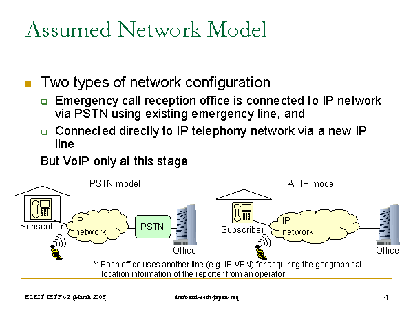 Assumed Network Model Two types of network configuration Emergency call reception office is connected to IP network via PSTN using existing emergency line, and Connected directly to IP telephony network via a new IP line But VoIP only at this stage Subscriber PSTN Subscriber Office Office *: Each office uses another line (e.g. IP-VPN) for acquiring the geographical location information of the reporter from an operator. IP network IP network PSTN model All IP model |