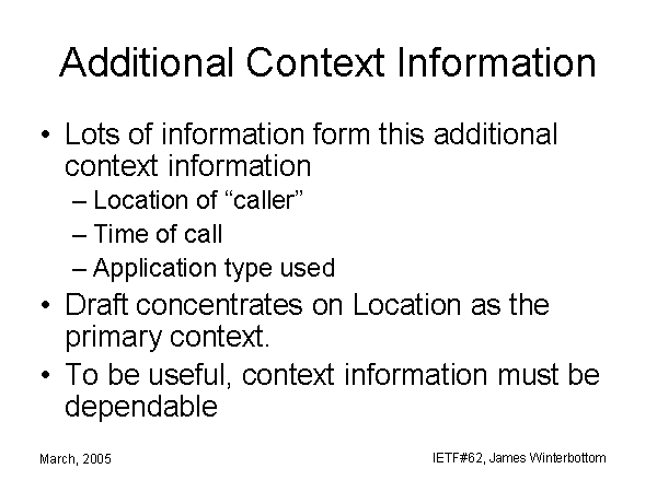 Additional Context Information Lots of information form this additional context information Location of “caller” Time of call Application type used Draft concentrates on Location as the primary context. To be useful, context information must be dependable |