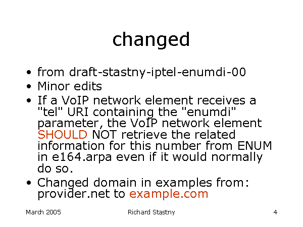 changed from draft-stastny-iptel-enumdi-00 Minor edits If a VoIP network element receives a "tel" URI containing the "enumdi" parameter, the VoIP network element SHOULD NOT retrieve the related information for this number from ENUM in e164.arpa even if it would normally do so. Changed domain in examples from:provider.net to example.com |