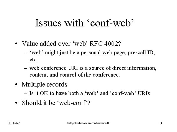Issues with ‘conf-web’ Value added over ‘web’ RFC 4002? ‘web’ might just be a personal web page, pre-call ID, etc. web conference URI is a source of direct information, content, and control of the conference. Multiple records Is it OK to have both a ‘web’ and ‘conf-web’ URIs Should it be ‘web-conf’? |