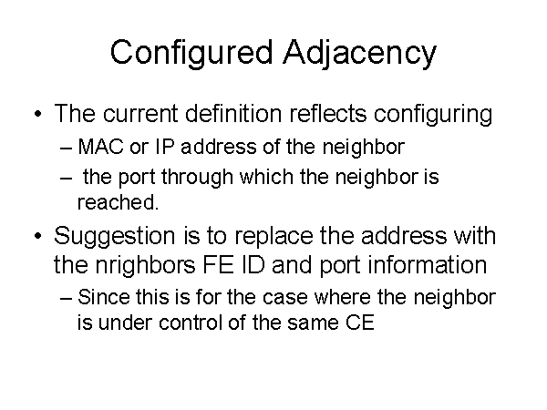 Configured Adjacency The current definition reflects configuring MAC or IP address of the neighbor the port through which the neighbor is reached. Suggestion is to replace the address with the nrighbors FE ID and port information Since this is for the case where the neighbor is under control of the same CE |