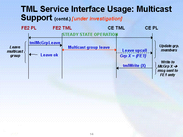 TML Service Interface Usage: Multicast Support (contd.) [under investigation] FE2 PL FE2 TML CE TML CE PL tmlMcGrpLeave Multicast group leave Leave multicast group STEADY STATE OPERATION Leave upcall Grp X = {FE1} Leave ok tmlWrite (X) Write to McGrp X ? msg sent to FE1 only Update grp. members |