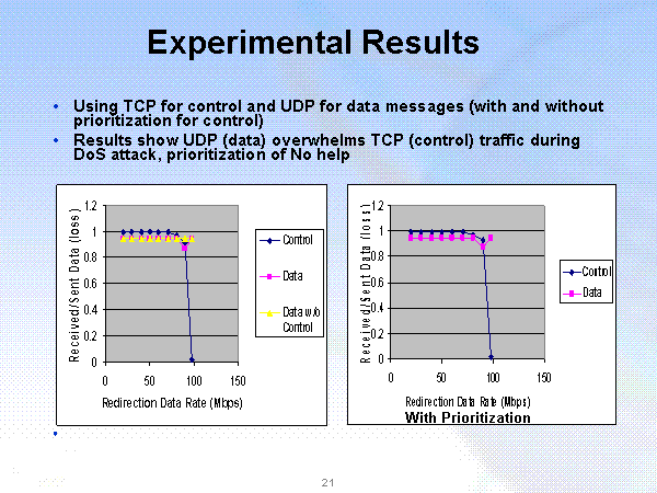 Results show UDP (data) overwhelms TCP (control) traffic during DoS attack, prioritization of No help