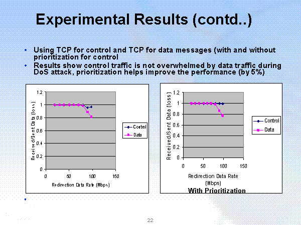 Experimental Results (contd..) Using TCP for control and TCP for data messages (with and without prioritization for control Results show control traffic is not overwhelmed by data traffic during DoS attack, prioritization helps improve the performance (by 5%) With Prioritization |