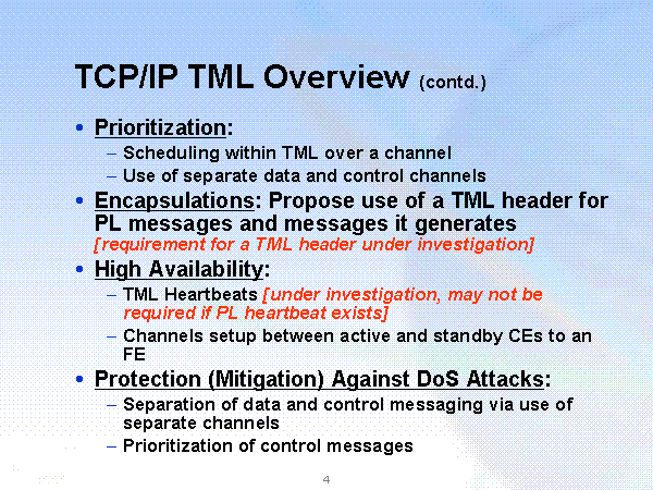 TCP/IP TML Overview (contd.) Prioritization: Scheduling within TML over a channel Use of separate data and control channels Encapsulations: Propose use of a TML header for PL messages and messages it generates [requirement for a TML header under investigation] High Availability: TML Heartbeats [under investigation, may not be required if PL heartbeat exists] Channels setup between active and standby CEs to an FE Protection (Mitigation) Against DoS Attacks: Separation of data and control messaging via use of separate channels Prioritization of control messages |