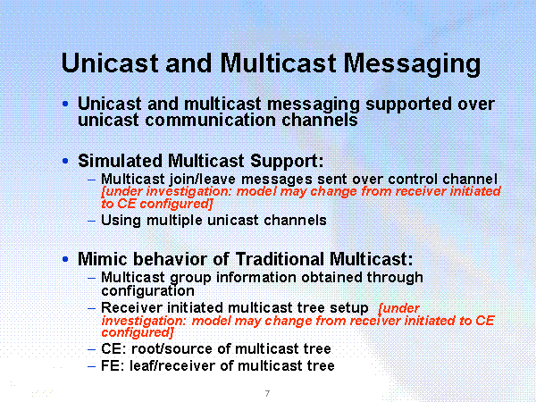 Unicast and Multicast Messaging Unicast and multicast messaging supported over unicast communication channels Simulated Multicast Support: Multicast join/leave messages sent over control channel [under investigation: model may change from receiver initiated to CE configured] Using multiple unicast channels Mimic behavior of Traditional Multicast: Multicast group information obtained through configuration Receiver initiated multicast tree setup [under investigation: model may change from receiver initiated to CE configured] CE: root/source of multicast tree FE: leaf/receiver of multicast tree |
