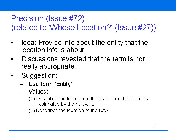 Precision (Issue #72)(related to ‘Whose Location?‘ (Issue #27)) Idea: Provide info about the entity that the location info is about. Discussions revealed that the term is not really appropriate. Suggestion: Use term “Entity” Values: (0) Describes the location of the user's client device, as estimated by the network. Describes the location of the NAS |