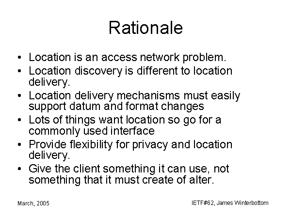 Rationale Location is an access network problem. Location discovery is different to location delivery. Location delivery mechanisms must easily support datum and format changes Lots of things want location so go for a commonly used interface Provide flexibility for privacy and location delivery. Give the client something it can use, not something that it must create of alter. |