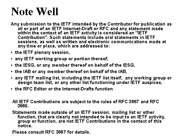 Note Well Any submission to the IETF intended by the Contributor for publication as all or part of an IETF Internet-Draft or RFC and any statement made within the context of an IETF activity is considered an "IETF Contribution". Such statements include oral statements in IETF sessions, as well as written and electronic communications made at any time or place, which are addressed to: • the IETF plenary session, • any IETF working group or portion thereof, • the IESG, or any member thereof on behalf of the IESG, • the IAB or any member thereof on behalf of the IAB, • any IETF mailing list, including the IETF list itself, any working group or design team list, or any other list functioning under IETF auspices, • the RFC Editor or the Internet-Drafts function All IETF Contributions are subject to the rules of RFC 3667 and RFC 3668. Statements made outside of an IETF session, mailing list or other function, that are clearly not intended to be input to an IETF activity, group or function, are not IETF Contributions in the context of this notice. Please consult RFC 3667 for details. |