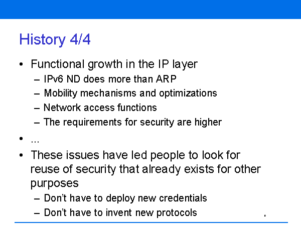 History 4/4 Functional growth in the IP layer IPv6 ND does more than ARP Mobility mechanisms and optimizations Network access functions The requirements for security are higher ... These issues have led people to look for reuse of security that already exists for other purposes Don’t have to deploy new credentials Don’t have to invent new protocols |