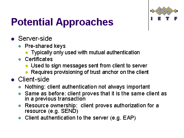 Potential Approaches Server-side Pre-shared keys Typically only used with mutual authentication Certificates Used to sign messages sent from client to server Requires provisioning of trust anchor on the client Client-side Nothing: client authentication not always important Same as before: client proves that it is the same client as in a previous transaction Resource ownership: client proves authorization for a resource (e.g. SEND) Client authentication to the server (e.g. EAP) |