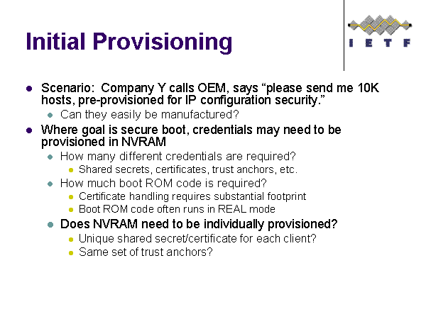 Initial Provisioning Scenario: Company Y calls OEM, says “please send me 10K hosts, pre-provisioned for IP configuration security.” Can they easily be manufactured? Where goal is secure boot, credentials may need to be provisioned in NVRAM How many different credentials are required? Shared secrets, certificates, trust anchors, etc. How much boot ROM code is required? Certificate handling requires substantial footprint Boot ROM code often runs in REAL mode Does NVRAM need to be individually provisioned? Unique shared secret/certificate for each client? Same set of trust anchors? |