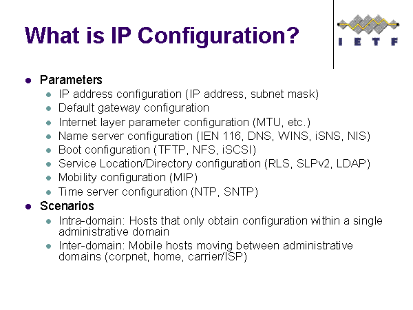 What is IP Configuration? Parameters IP address configuration (IP address, subnet mask) Default gateway configuration Internet layer parameter configuration (MTU, etc.) Name server configuration (IEN 116, DNS, WINS, iSNS, NIS) Boot configuration (TFTP, NFS, iSCSI) Service Location/Directory configuration (RLS, SLPv2, LDAP) Mobility configuration (MIP) Time server configuration (NTP, SNTP) Scenarios Intra-domain: Hosts that only obtain configuration within a single administrative domain Inter-domain: Mobile hosts moving between administrative domains (corpnet, home, carrier/ISP) |