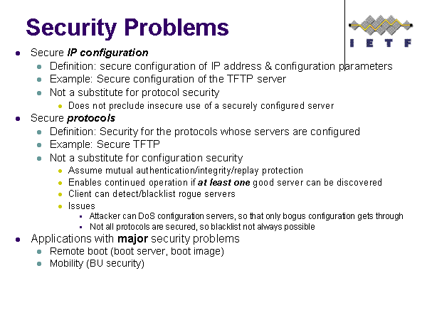 Security Problems Secure IP configuration Definition: secure configuration of IP address & configuration parameters Example: Secure configuration of the TFTP server Not a substitute for protocol security Does not preclude insecure use of a securely configured server Secure protocols Definition: Security for the protocols whose servers are configured Example: Secure TFTP Not a substitute for configuration security Assume mutual authentication/integrity/replay protection Enables continued operation if at least one good server can be discovered Client can detect/blacklist rogue servers Issues Attacker can DoS configuration servers, so that only bogus configuration gets through Not all protocols are secured, so blacklist not always possible Applications with major security problems Remote boot (boot server, boot image) Mobility (BU security) |