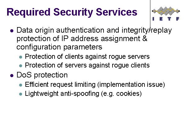 Required Security Services Data origin authentication and integrity/replay protection of IP address assignment & configuration parameters Protection of clients against rogue servers Protection of servers against rogue clients DoS protection Efficient request limiting (implementation issue) Lightweight anti-spoofing (e.g. cookies) |